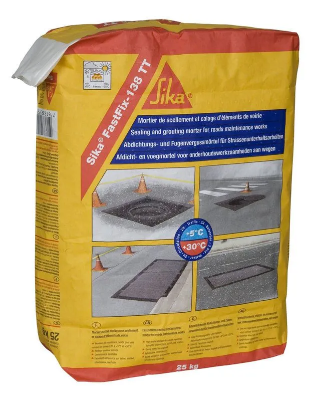 Avantages Produit : Sika Fastfix 138 TT est un micro-béton hydraulique prêt à l’emploi à durcissement rapide conçu pour les scellement, le calage d’éléments de voirie, la réalisation de joints de chaussée et la réparation de nid poule en sol avec une remise en service rapide à toute température. Température d’application : +5°C à +30°C Densité : 2,2 – 2,3 environ Granulométrie : 0 / 8 mm Matériel : Malaxeur muni d’une hélice 4 branches, bétonnière, auge, truelle Remise en service : 2 heures environ à toute température comprise entre +5°C et +30°C Consommation : Environ 2,3 kg / litre de scellement A savoir : Le mortier frais doit être protégé de la pluie pendant la prise.