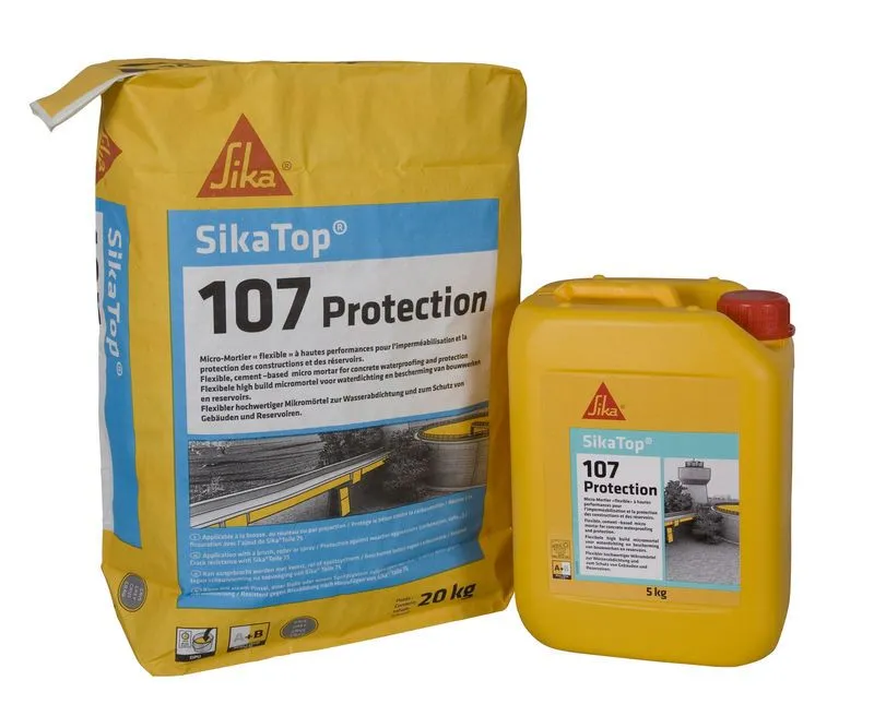 Avantages Produit : SikaTop 107 Protection est un micro-mortier hydrolique permettant de protéger et d’imperméabiliser du béton. Température d’application : + 5 à + 30°C Densité : environ 2 pH : 7 à 9 Granulométrie : 0 / 0,5 mm Epaisseur par couche : 0,8 à 1,0 mm environ Durée pratique d’utilisation : 30 à 40 min à 20°C Temps d’attente : Entre deux couches: 2 à 6 heures Consommation : 3 à 4 kg/m² pour les deux couches A savoir : Les supports béton doivent être âgés de plus de 28 jours. Doit être protégé du gel, du vent et du soleil pendant la prise et le durcissement.