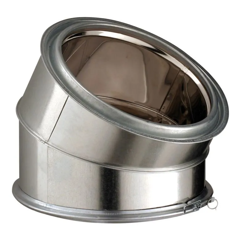 Coude à 30°isolé par laine de roche avec un embouti à chaque extrémité (Inox intérieur, Galva extérieur). Muni d’un collier de sécurité et d’une goupille. Il permet d’effectuer les dévoiements. Sens de pose indiqué sur l’étiquette.