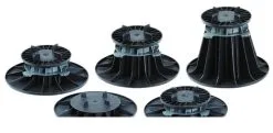 Les plots à vérins réglables sont des supports pour dalles bois, céram, béton… Ils ont pour vocation principale de supporter les dalles d’aménagement, de protéger l’étanchéité et de laisser un minimum de ventilation pour l’évaporation d’eau. Ils libèrent un espace pratique pour le passage de câblages ou réseaux pour équipements divers (éclairage…). Ces plots disposent en partie haute de 4 entretoises permettant la jonction et le blocage des dalles rapportées. Le calepinage et la mise en œuvre sont associés aux formats des dalles choisies. les plots pour dalles s’associent avec des rehausses pour atteindre une hauteur maximum de 700 mm.